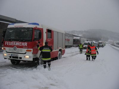 Die Wiener Außenringautobahn (A21) wurde zwischen dem Knoten Steinhäusl und Vösendorf in beiden Fahrtrichtungen komplett gesperrt. Die ersten freiwilligen Feuerwehren aus dem Bezirk Baden wurden gegen ca. 19:45 Uhr alarmiert und eine Einsatzleitung aller Einsatzorganisationen direkt bei der Autobahnmeisterei Alland eingerichtet. Die Hauptaufgabe der Feuerwehr war, die hängen geblieben Lkws und Pkws frei zu schleppen bzw. auch aus Straßengräben zu bergen.