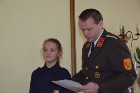 Danach überreichte LM Iris Rath der Feuerwehrjugend die Fertigkeitsabzeichen „Melder“, die sie sich während des Orientierungsbewerbs im Oktober verdient hatten. JFM Sabrina Pfeiffer erhielt dabei auch ihre neuen Dienstgrade für die bestandene erste Erprobung ein Monat davor. Ihre Schwester Nadine Pfeiffer wurde als jüngstes Feuerwehrmitglied angelobt.