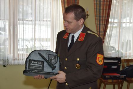 Beide nahmen die Wahl an, die neue Kommandantin übernahm den Vorsitz und bedankte sich für das Vertrauen. Andrea Triebenbacher wurde als Leiterin des Verwaltungsdienstes bestätigt, Mario Pfeiffer und Hans Rath erhielten als Dank für ihre Tätigkeit eine Urkunde und ein Geschenk. Ebenso wurde Hans Rath zum Ehrenbrandinspektor und Mario Pfeiffer zum Ehrenkommandanten ernannt.