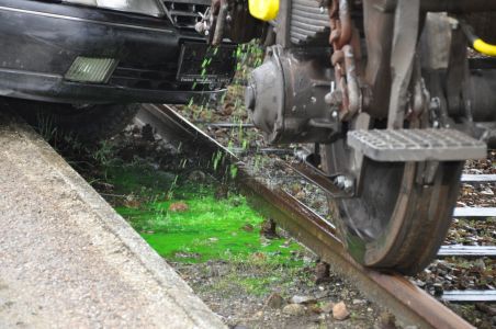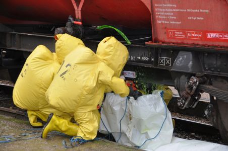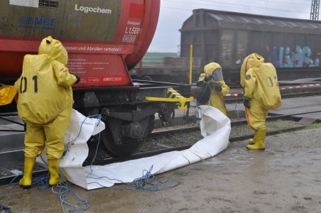 • Das Auto beschädigte beim Unfall einen Kesselwagen, aus dem eine Flüssigkeit sprudelte. Die Gefahrennummer 1830 kennzeichnete den Inhalt des Kesselwagens als Schwefelsäure – ein Fall für die Schadstoffgruppe des Abschnitts! Sie fing den Schadstoff auf und dichtete das Leck ab.