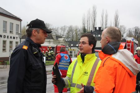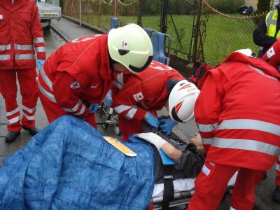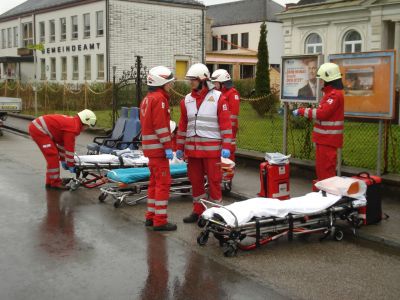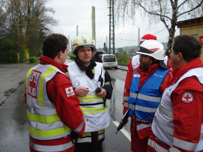 • Das Rote Kreuz transportierte die Verletzten ab und versorgte sie. Auch sie waren gefordert – jeder Verletzte simulierte bestimmte Symptome, die die Rettungskräfte erkennen und richtig behandeln mussten.