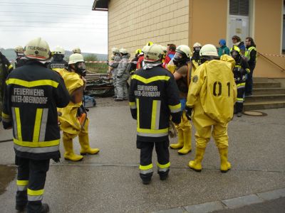 Auch die Spezialkräfte sind eingetroffen und steigen mit ihren Atemschutzgeräten in die gelben Schutzanzüge. Der Einsatzleiter hatte nach der Erkundung die Schadstoffgruppe des Abschnitts Neulengbach angefordert.
