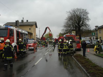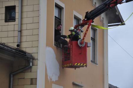 • Auch der Kran der FF Ollersbach kam zum Einsatz – mit ihm wurde ein Mann aus dem ersten Stock des Bahnhofsgebäudes gerettet. Ihm versperrten die Rauchgase des Kellerbrandes den Weg.