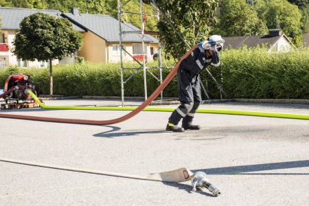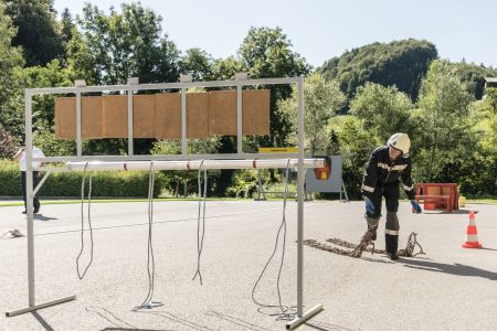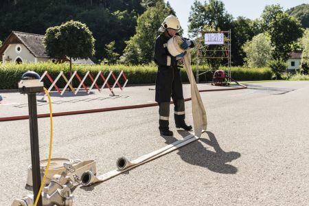 Dabei mussten die Teilnehmer zwei B-Schläuche (Damen: C-Schläuche) ausrollen, kuppeln, ein Strahlrohr ankuppeln, den Verteiler aufdrehen und die Schlauchleitung 37m (Damen: 27m) bis zu einer Markierung ausziehen.