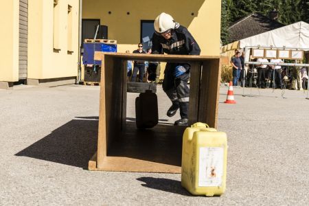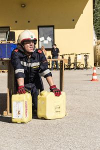 Hier ging es nicht um’s Ziehen, sondern um’s Schleppen: Während die Männer zwei Schaummittelkanister á 20kg über die Hindernisstrecke schleppten und durch den Kriechtunnel warfen, absolvierten die Damen die gleiche Strecke mit zwei Treibstoffkanistern á 8kg. Danach stellten sie die Kanister am Startpunkt wieder in die Markierungen.