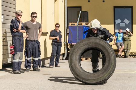Bei dieser Station durften die Wettkämpfer einen LKW-Reifen insgesamt 10 Mal wenden (Damen: 6 Mal) und wieder in der Markierung ablegen.