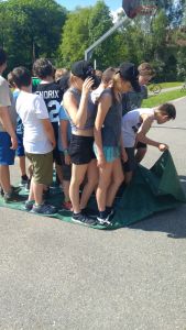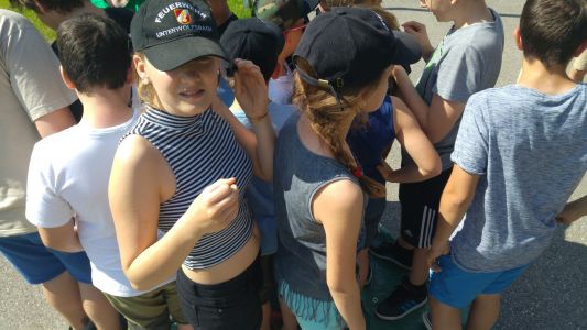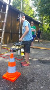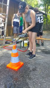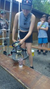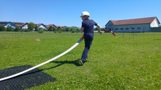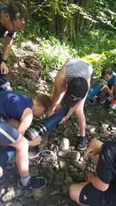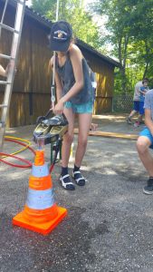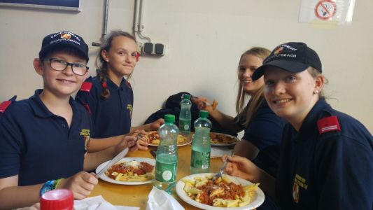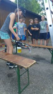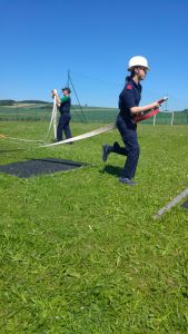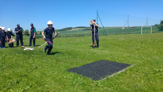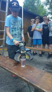 Samstag Mittag trafen die Jungfeuerwehrmänner des Abschnitts auf der Lagerwiese in der Nähe des Feuerwehrhauses ein. Wer dort übernachtete, stellte sein Zelt auf, der Rest wartete auf den Beginn des Stationsbetriebes ab 1430. Die Feuerwehren Innermanzing und Brand-Laaben hatten sich hier einiges überlegt. Bei vier Stationen übten die Lagerteilnehmer, im Laabenbach eine Ölsperre zu errichten und mit Hebekissen ein Mannschaftsfahrzeug auf einer Seite anzuheben. Bei einer Gruppenarbeit war Zusammenarbeit gefordert – 17 Kinder standen auf einer Plane und mussten diese umdrehen, ohne auf den Boden zu steigen. Auch eine Station mit Schere und Spreizer erforderte Geschicklichkeit: Hier mussten die Burschen und Mädchen der Feuerwehren mit diesen Bergewerkzeugen einen Plastikbecher von einer Bank auf die Andere stellen. Die Königsdisziplin dieser Station war, den Becher mit dem Spreizer auf einem Verkehrsleitkegel zu platzieren – was unsere Jugend mit Bravour geschafft hat!