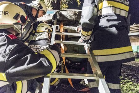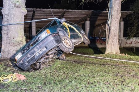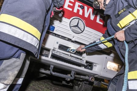 2016 waren einige unserer Kameraden dabei, zwei von ihnen – Hauptbrandinspektor Mario Pfeiffer und Brandinspektor Johann Rath – gaben ihr Wissen heute an die Teilnehmer der Übung weiter. Nachdem sie das Fahrzeug gegen Umkippen gesichert hatten, hieß es, die Räder wieder auf den Boden zu bekommen. Hier arbeiteten die Mannschaften am Greifzug und beim Tanklöschfahrzeug Hand in Hand zusammen. Während die einen das Auto zum Kippen brachten, ließen es die anderen Zentimeter für Zentimeter herunter, bis es schließlich sanft auf den Rädern zu stehen kam.