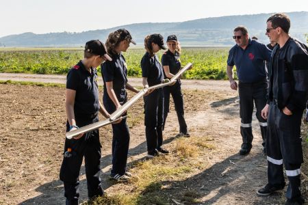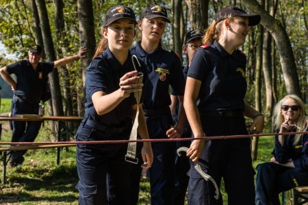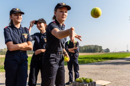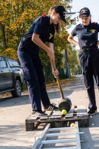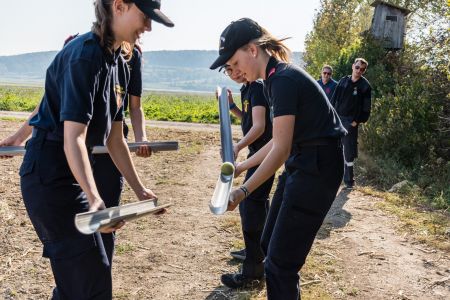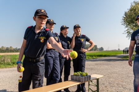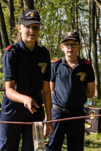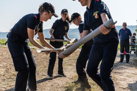 - Station 3: Einen Kupplungsschlüssel und einen Schlauchhalter so werfen, dass er auf einem gespannten Seil hängen bleibt.