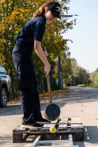 - Station 2: Einen Tennisball mittels Holzschlegel über so viele Leitersprossen wie möglich schlagen.