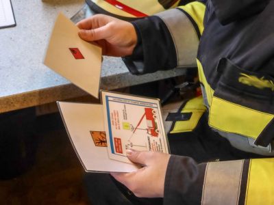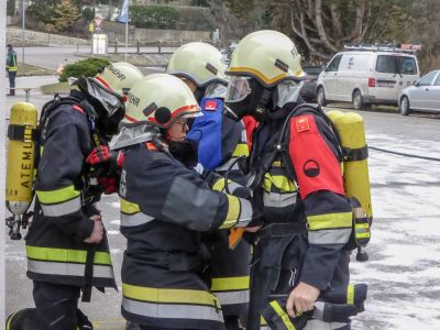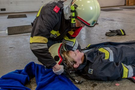 Es folgten die Nachbesprechung, der Atemschutztrupp rüstete die Geräte um und überprüfte sie, und alle Teilnehmer räumten die Einsatzstelle wieder zusammen. Als Schlusspunkt des Prüfungsprogramms überreichte das Prüferteam die Abzeichen.
