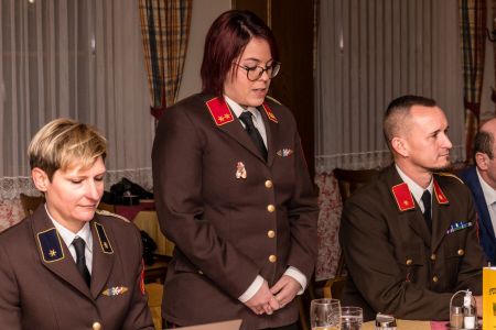 Nächster Punkt auf der Agenda waren die Angelobungen. Sabrina Pfeiffer und Annika Gneist legten ihr Gelöbnis ab und wurden in den Aktivstand überstellt. Marlene Triebenbacher wurde in die Feuerwehrjugend angelobt.
