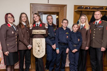 Jugendbetreuerin Jasmin Pfeiffer fasste die Aktivitäten der Feuerwehrjugend zusammen. Auch 2018 war ein ausgefülltes Jahr für unsere Jugend. In einer gemeinsamen Bewerbsgruppe mit den Jugendgruppen der Nachbarorte Totzenbach und Ollersbach verdiente sich unser Nachwuchs bei zahlreichen Bewerben seine Leistungs- und Fertigkeitsabzeichen. Sie waren beim Abschnittslager in Inprugg und beim Landeslager in St. Aegyd am Neuwalde dabei. Nach dem Ende des Berichts gab es für die Jugendgruppe noch eine Überraschung: Sie erhielt ein Schild, mit dem ihr Zelt auf den Jugendlagern nun eindeutig erkennbar ist. Über dem Schild ist der Schriftzug Unterwolfsbach, das Schild selbst ziert ein eingebrannter Wolf mit dem Logo der Feuerwehrjugend. What else!