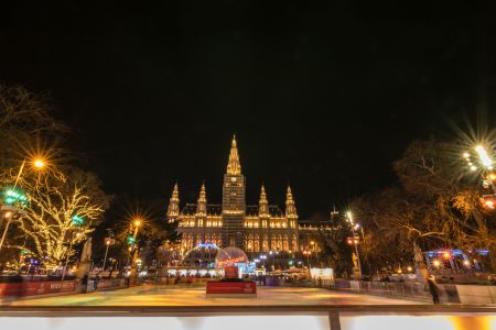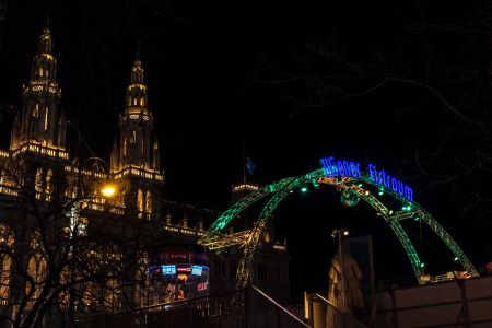 Gegen 1600 Uhr waren wir am Rathausplatz in Wien, der echte Zauber entfaltet sich aber erst bei Dunkelheit. Im Schein der beleuchteten Bäume schlängelten sich 550m Eisbahnen durch den Rathauspark. Die Eisfläche auf dem Rathausplatz war heuer sogar zweistöckig. Auf insgesamt 9.000m² Eisfläche war es kein Problem, dort ein paar schöne Stunden zu verbringen.