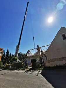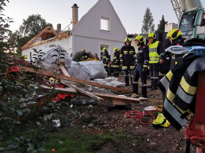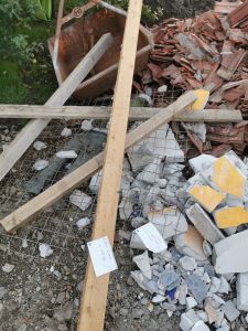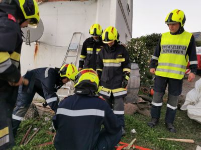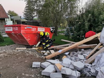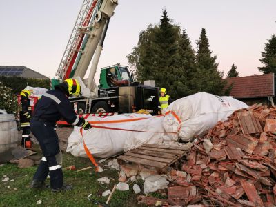 Bei der letzten Übung sah es aus wie in einem Katastrophengebiet: Schutthaufen, Holz und Dämmwolle lagern auf der umgeackerten Wiese herum. Doch Hintergrund der Übung war kein Erdbeben oder eine Gasexplosion, sondern schlicht ein Unfall auf einer Baustelle: Die Last eines Krans riss ab und traf eine Person (hier natürlich unsere Übungspuppe). Diese hatte Glück im Unglück. Eine Schuttmulde bremste die Balken und Eisenmatten, wodurch das Opfer noch lebte. Lediglich ein Eisenteil im Oberschenkel beeinträchtigte das Wohlbefinden. Die Chancen auf eine Rettung waren gut. Dabei verwendeten wir unterschiedliche Ausrüstung aus unserem Tanklöschfahrzeug: Bolzenschneider, Freilandverankerung, LKW-Spanngurte und das Hebekissen wollten im TLF gefunden und richtig eingesetzt werden. Auch die Erste Hilfe kam nicht zu kurz.