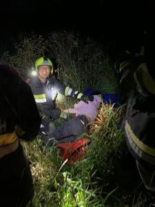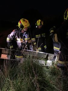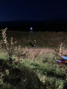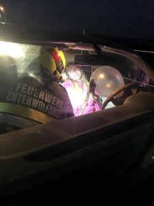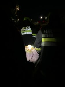 Auf einem Güterweg kamen sich zwei Autos entgegen. Die Fahrerinnen verrissen offensichtlich ihre Fahrzeuge und kamen halb auf der Straße, halb auf der Wiese zum Stehen. Ein Fahrzeug blieb dabei in einem Elektrozaun hängen und verlor Flüssigkeit. Das spannende an diesem Szenario: Eine Fahrerin war verschwunden! Während sich Kameraden um die eine Fahrerin kümmerten und die Flüssigkeit mit Ölbindemittel banden, suchte der Rest der Mannschaft die vermisste Fahrerin. Dabei kam auch wieder einmal die Wärmebildkamera zum Einsatz. Nach etwa zehn Minuten wurde sie bewusstlos im Gebüsch gefunden – ganz oldschool mit dem Handscheinwerfer. Bei der Nachbesprechung waren sich alle einig: Es war eine interessante Übung!
