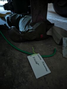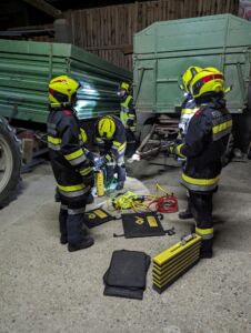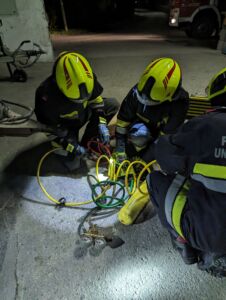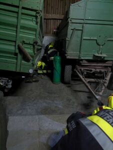 Bei dieser Übung ging es wieder um die wesentlichen Grundlagen für den Einsatzleiter: Beurteilung der Lage und Arbeitssicherheit. Annahme war ein Unfall bei Instandsetzungsarbeiten an einem Anhänger. Bei Schweissarbeiten gab der Wagenheber den Geist auf, das „Opfer“ wurde am Oberschenkel eingeklemmt. Die Flamme am Schweißgerät ging aus, es strömte weiter ein explosives Acetylen/Sauerstoffgemisch aus. Der Einsatzleiter stand nun vor der Herausforderung, im ersten Schritt die Gefahr für den Verletzten und die Einsatzkräfte zu beseitigen, den Anhänger abzusichern und den Verletzten zu retten.
