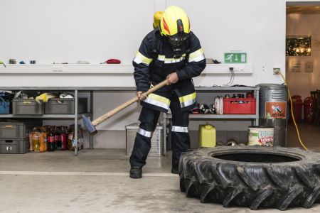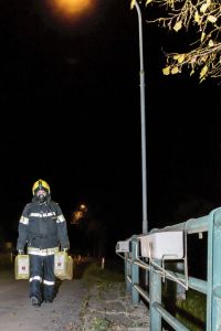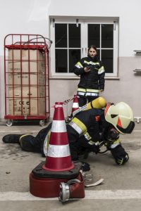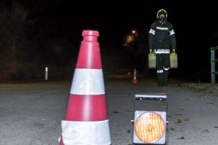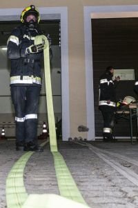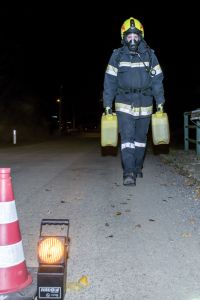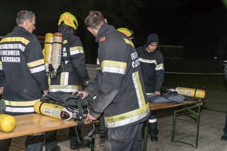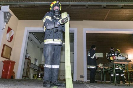 Die Feuerwehr Unterwolfsbach ergriff nun die Initiative und lud die Nachbarfeuerwehren Kirchstetten, Ollersbach und Totzenbach zum gemeinsamen Finnentest ein. Doch das war noch nicht alles! Die Feuerwehr Unter-Oberndorf stellte uns dankenswerter Weise ihren Atemluftkompressor samt Personal zum Füllen der Pressluftflaschen zur Verfügung – und schickte gleich noch ein paar Mann zur Atemschutzüberprüfung mit. So waren am Abend des 10. November 33 Feuerwehrmänner und -frauen in unserem Feuerwehrhaus und schleppten Schaummittelkanister durch die Nacht, stiegen Stiegen, wuzelten sich in voller Montur unter Absperrbändern durch und prügelten einen wehrlosen Traktorreifen durch die Garage.