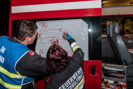 Der Gedanke, eine Lage mit dynamischer Entwicklung darzustellen, ging auf. Die Einsatzleitung wechselte durch den Ausfall von Unterwolfsbach zur ersten eintreffenden Feuerwehr des Unterabschnitts. Nach etwa 15 Minuten wechselte sie wieder zu Unterwolfsbach, an einen Feuerwehrmann, der zum Einsatz nachgekommen war. Nach anfänglicher Verwirrung mit Tendenz zum 3D-Einsatz (drunter, drüber, durcheinand‘) hatten die jeweiligen Einsatzleiter die Lage im Griff, und Menschenrettung, Brandbekämpfung und Schutz nahmen ihren Lauf.