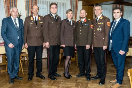 2. Reihe: Alt-Abschnittskommandant Franz Gruber, Michael Fußthaler, Claus Triebenbacher, Andrea Triebenbacher, Bürgermeister Jürgen Rummel, Abschnittskommandant Richard Kraus