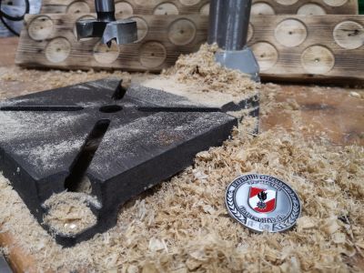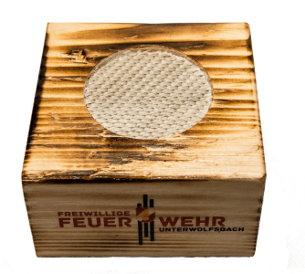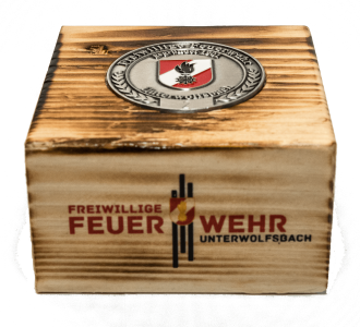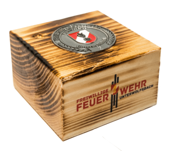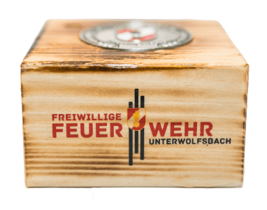 Übergeben wird die Münze in einem extra dafür angefertigten Holzblock. In Erinnerung an die Einsatzarten der Feuerwehr (technische Einsätze und Brandeinsätze) besteht der Block aus geschliffenem und geflämmtem Pölzholz. Die Münze liegt in einer gefrästen Aussparung, die mit einem Stück Feuerwehrschlauch ausgelegt ist. Die Vorderseite trägt das Logo der Freiwilligen Feuerwehr Unterwolfsbach. Der Beliehene erhält ebenso eine Verleihungsurkunde.