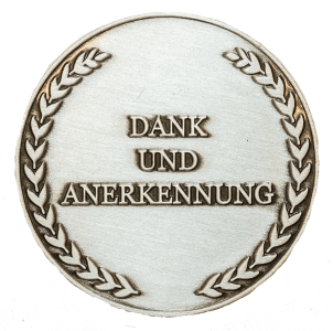 Die Rückseite zeigt einen umlaufenden Lorbeerkranz, in dessen Mitte die Worte „DANK UND ANERKENNUNG“ stehen.