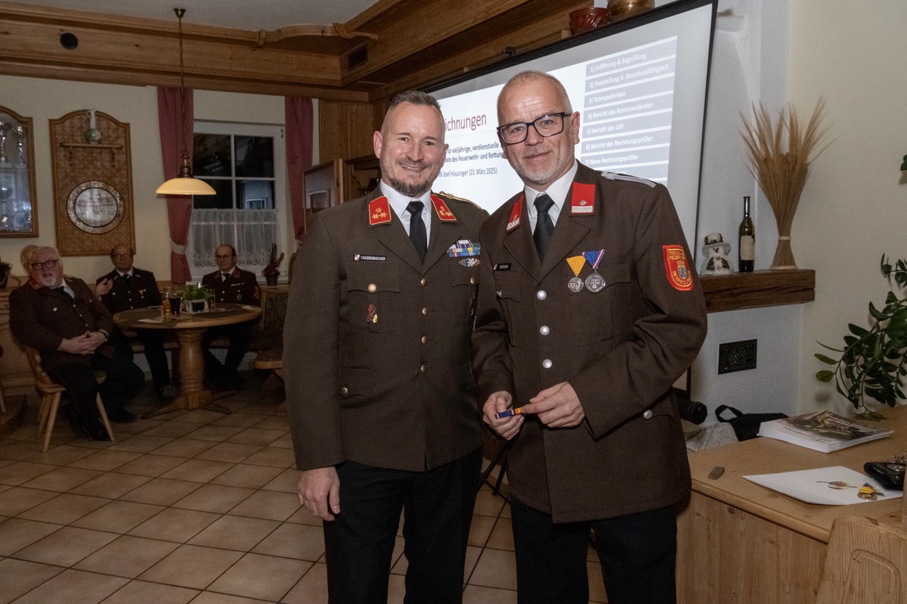 Sein erklärtes Ziel war, das Feuerwehrhaus und die Einsatzfahrzeuge in Unterwolfsbach trotzdem zu erhalten. Nach Gesprächen mit der Gemeinde und benachbarten Feuerwehren ergab sich eine einzige Lösung: Als abgesetzter Zug der Freiwilligen Feuerwehr Ollersbach. In der letzten Sitzung, die laut Tagesordnung mit dem Beschluss zur Auflösung der Feuerwehr Unterwolfsbach geendet hätte, standen zwei bewährte Florianis auf und sprangen in die Bresche: Ehrenhauptbrandinspektor Mario Pfeiffer, von 2005 bis 2016 selbst Kommandant, bot sich für die kommenden fünf Jahre als Kommandant-Stellvertreter an. Oberbrandinspektor Christian Pfeiffer, Kommandant des Niederösterreichischen Tauchdienstes und früher Verwalter im Abschnittsfeuerwehrkommando Neulengbach, stellte sich als Leiter des Verwaltungsdienstes zur Verfügung und übernahm bereits Mitte 2025 die finanziellen Angelegenheiten der Wehr. Kommandant Claus Triebenbacher dazu: „Unsere Personalsituation ist angespannt. Wir haben im Ort keinen Nachwuchs mit Interesse an der Feuerwehr und keinen Zuzug. Die Generation um die 30, die jetzt eine Funktion übernehmen könnte, fehlt komplett. So sind die nächsten fünf Jahre gesichert – und in fünf Jahren kann sich vieles ändern!“ Auch er stellte sich nach sieben Jahren als Kommandant noch einmal zur Verfügung. Beide Kandidaten wurden einstimmig gewählt.