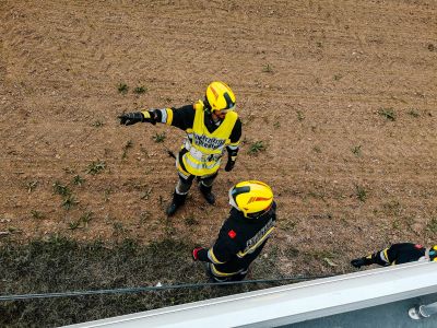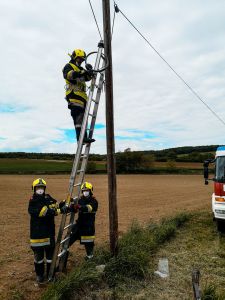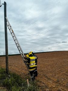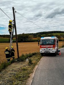 Gegen 13.20 alarmierte uns eine Autofahrerin, dass der Wind die Leitung wieder gefährlich über die Straße drückte. Für PKW bestand zwar keine Gefahr, für große Fahrzeuge wie Busse und Landmaschinen hing sie allerdings in einer gefährlichen Höhe. Nach einer Erkundung alarmierten wir die notwendige Mannschaft und rückten mit vier Personen aus. Bei diesem Einsatz machte sich die gestrige Übung zum Thema Leitern gleich bezahlt! Nach einer knappen Stunde war das Kabel verkürzt, gesichert und wir rückten wieder ein.