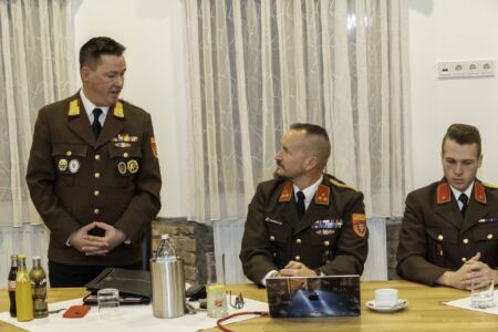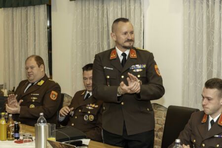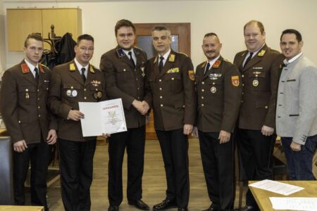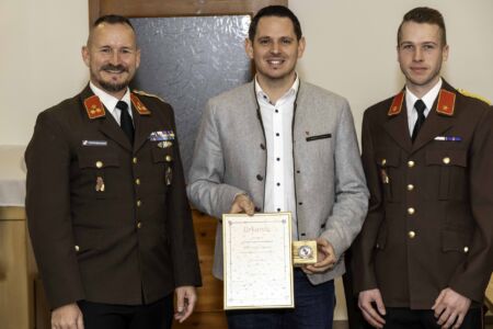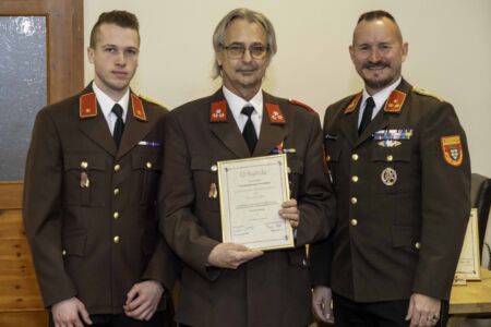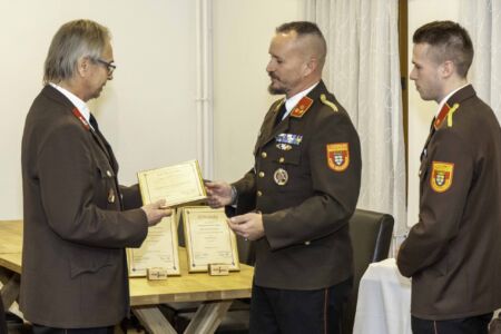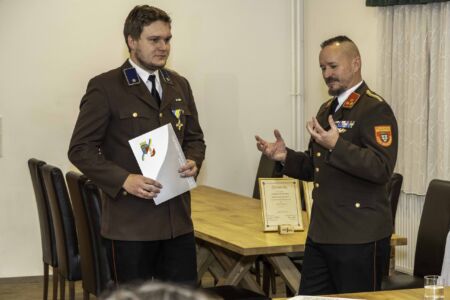 Nächster Punkt auf der Agenda waren die Angelobungen, Beförderungen und Ehrungen. Walter Schwarz wurde in die Reserve versetzt. Bürgermeister Jürgen Rummel und Abschnittskommandant Brandrat Richard Kraus (vertreten durch Abschnittskommandant-Stellvertreter Rupert Bauer) erhielten als Dank für ihre stete Unterstützung die Ehrenmünze der Freiwilligen Feuerwehr Unterwolfsbach. Der frühere Verwalter der Feuerwehr, Michael Fußthaler, wurde von Bezirksfeuerwehrkommandant Georg Schröder mit dem Verdienstzeichen in Silber ausgezeichnet. Die Feuerwehr bedankte sich bei ihm mit einem Feuerkorb. Fußthaler legte seine Funktion als Verwalter im Sommer 2024 zurück und ist seit November endgültig Mitglied bei der FF St. Pölten – Spratzern, in deren Eindsatzgebiet er bereits seit Jahren wohnt.