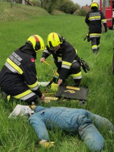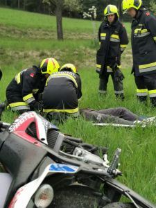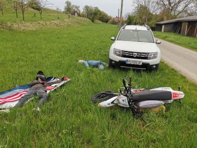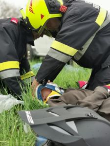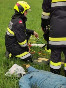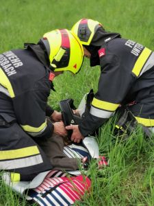 Eine spannende Ausgangslage gab es bei unserer gestrigen Übung: Ein Moped war mit einem Auto zusammengestoßen. Der Mopedfahrer war mit einem Fuß unter dem Reifen eingeklemmt, seine Mitfahrerin lag bewusstlos in der Wiese. Für den Einsatzleiter war klar: Das bewusstlose Mädchen hat Priorität. Der zweite Trupp kümmerte sich um den verletzten Mopedfahrer und befreite ihn mit Hebekissen aus seiner Zwangslage. Schwerpunkte waren die richtige Erste-Hilfe-Maßnahmen bei Zweiradfahrern und das Arbeiten mit Hebekissen. Beide Szenarien waren flott abgearbeitet. Eine kurze Wiederholung der richtigen Erste-Hilfe-Maßnahmen für alle rundete die Übung ab.