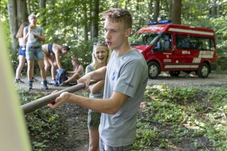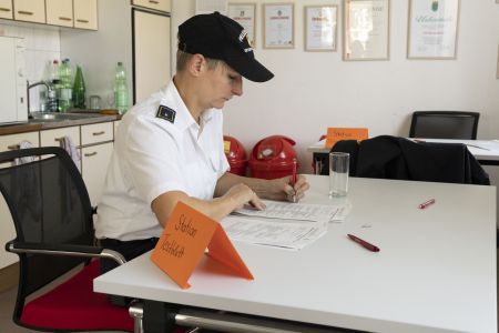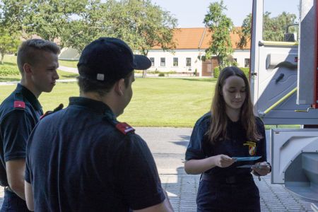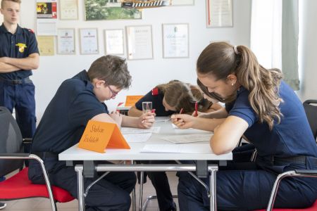 Die 12 bis 15-jährigen stellen sich nach dem Theorietest einem Stationsbetrieb, wo Ausbilder das Wissen der Jungfeuerwehrmänner überprüfen. Neben dem Erkennen der bei der Feuerwehr verwendeten Dienstgrade müssen Knoten richtig gemacht werden. Die Kenntnis über Gerätschaften für den Brand- bzw. technischen Feuerwehreinsatz wird ebenso abgeprüft. Hier ziehen die Jugendlichen Kärtchen; das darauf aufgeführte Gerät müssen sie erkennen und dessen Funktion erklären. Grundlagenwissen, das im späteren aktiven Feuerwehrleben jederzeit benötigt wird.