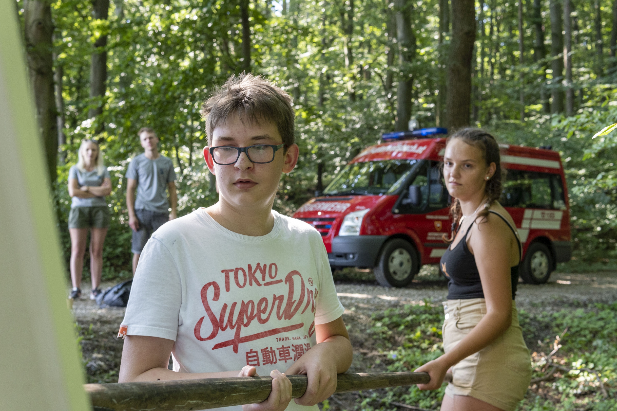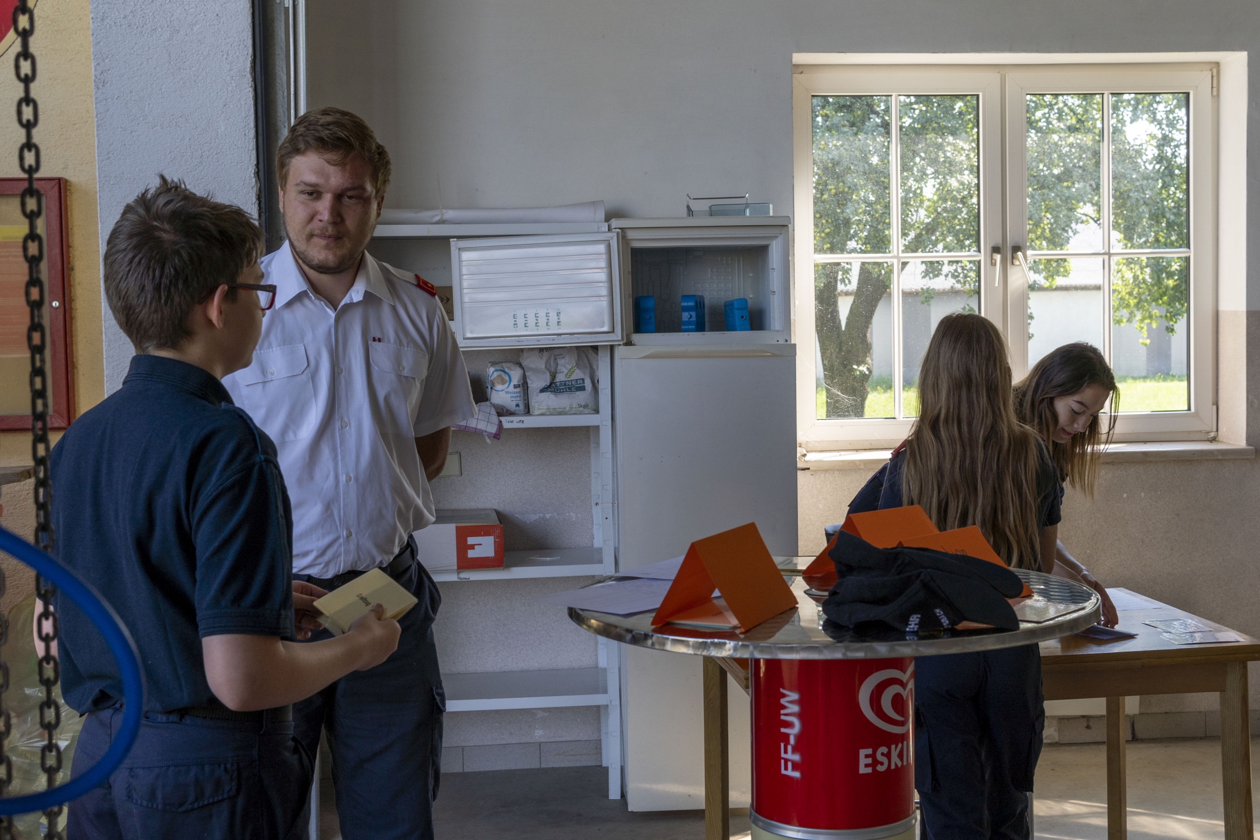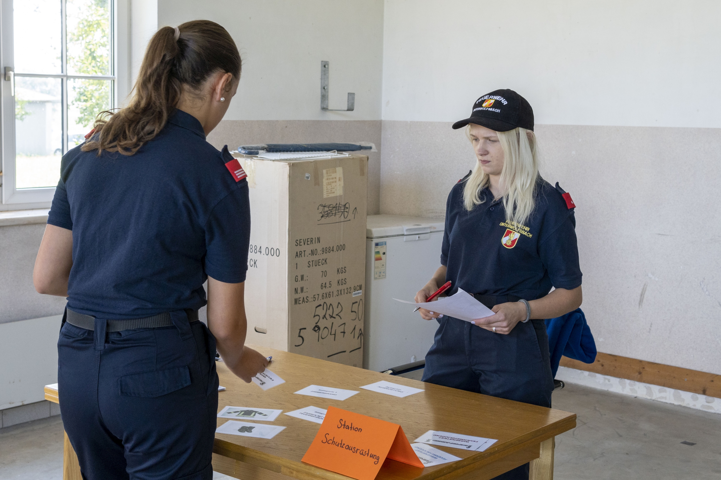 Die 12 bis 15-jährigen stellen sich nach dem Theorietest einem Stationsbetrieb, wo Ausbilder das Wissen der Jungfeuerwehrmänner überprüfen. Neben dem Erkennen der bei der Feuerwehr verwendeten Dienstgrade müssen Knoten richtig gemacht werden. Die Kenntnis über Gerätschaften für den Brand- bzw. technischen Feuerwehreinsatz wird ebenso abgeprüft. Hier ziehen die Jugendlichen Kärtchen; das darauf aufgeführte Gerät müssen sie erkennen und dessen Funktion erklären. Grundlagenwissen, das im späteren aktiven Feuerwehrleben jederzeit benötigt wird.